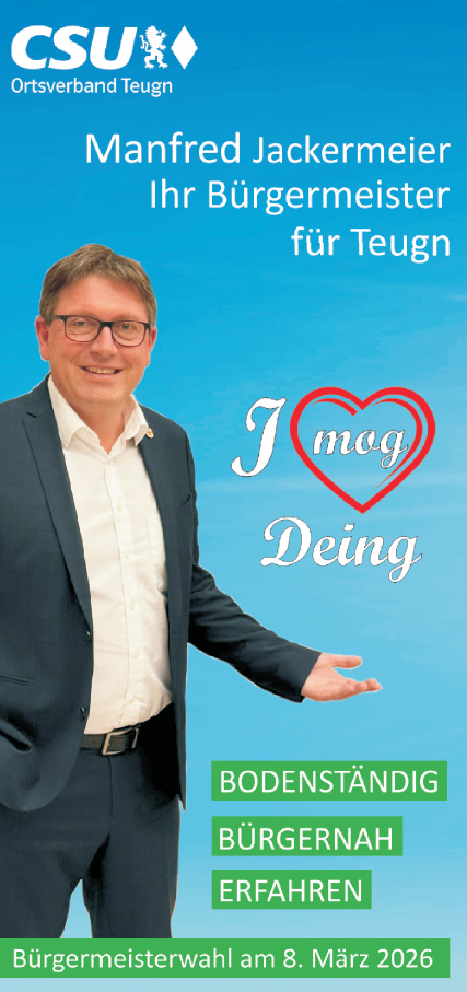 Aus dieser tiefen persönlichen Überzeugung heraus bewerbe ich mich erneut um das Amt des Ersten Bürgermeisters der Gemeinde Teugn. Ich bitte Sie daher herzlich um Ihr Vertrauen und um Ihre Stimme als Bürgermeister sowie als Gemeinde- und Kreisrat.